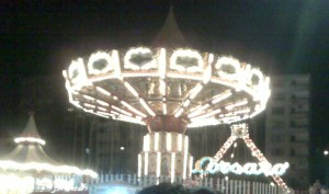 Özellikle bir alet vardı ki, tasvir etmeden geçemeyeceğim..Balerin şeklinde bir mekanizma düşünün, 2şerli koltuklara biniyorsunuz ve arka arkaya vagonlara diziliyorsunuz..Öyle korkunç bir hızda dönüyor ki, izlerken önünüzden geçenlerin suratını seçme imkanınız olmuyor, yuvarlak alet bir çizgi halinde görünüyor..Zaten iki kere hızı doruk noktasına ulaşıyor ve arada bir mola veriliyor, herhalde ayılıp bayılan var mı, ona bakıyorlar:) Çünkü o hıza belli bir süreden fazla tahammül etmek mümkün değil..Tabii bu sırada sizi uyduruk bir emniyet kemerine bağlı demirin tuttuğunu söylemeden geçmeyeyim.. Gondolların emniyetinin de her an çıkacakmış gibi duran bir çubukla sağlandığını düşünürsek; aletlerin güvenilirliği konusunda şüpheci olmak gerek ..  Aslında buna ‘kelle koltukta eğlence’ de diyebiliriz:)   Herkese püfür püfür, limonata ferahlığında ağustoslar..