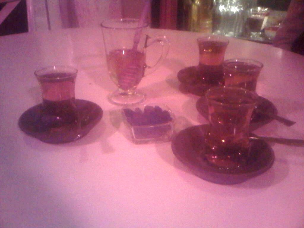 Hakiki sahlep yaptıklarını duyunca içelim dedik, hakikaten muhallebi gibi, kıvamlı ve pek lezzetli geldi.. Sonra çaylar masaya kondu, keyfi detaylarında gizli halde. Hiçbir yerde çayın beraberinde bal ve yemiş getirdiklerini görmemiştim, hoş bir sunum olarak hafızamda yer etti. Tatlılarından yemedik, ancak görüntülerinin pek çekici olduğunu söyleyebilirim. Burada gününe göre farklı yemek seçeneklerinin ve her daim  bulunan bazı özel yiyeceklerinin olduğu da kulağıma gelenler arasındaydı, fakat deneme fırsatımız olmadı..Bir dahaki sefere artık.